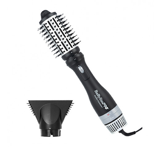 Dry, smooth, volumise and add shine with one easy peasy tool! Styling couldnt be simpler with BaBylissPRO Nano Titanium Detachable 2 in 1 Hot Air Brush and Dryer. This lightweight, ergonomic and ultra-quiet tool creates professional blow-dries at home. With detachable hairdryer head and hot air brush head, switch it up and style it up. Lightweight, ergonomic and ultra-quiet. BaByliss PRO dual ionic technology with 2 ion emitters creates twice the ions for optimal smoothness and shine. 6 heat/speed settings. Larger 51mm barrel ensures gorgeous volume and movement.