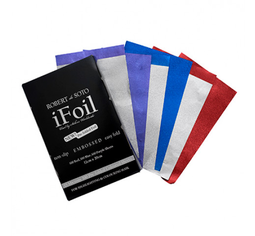 Save time with pre-folded, pre-cut hairdressing foil! Robert de Soto iFoil makes foil super convenient with iFoil Coloured Embossed Pre-Cut Foil 300 Sheets. Each sheet measures 12cm x 20cm and is great for all foiling work in the salon environment. Pre-folded sheets save precious time simply grab a foil and get going! 15 micron foil wont weigh hair down. Embossed foil gives a secure grip in the hair. Includes three assorted colours, red, blue and purple, with 100 sheets of each. Differing colours help you keep track of tones.
