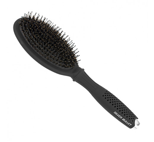 The Silver Bullet Black Velvet Cushion Hair Brush creates hair as smooth and soft as velvet! Utilising porcupine bristle, a combination of nylon and boar, and a soft cushion base this is the perfect finishing brush for brushing out, smoothing, increasing shine, detangling and removing product build up! Boar bristles distribute your hairs natural oils for a soft and shiny result. Nylon bristles detangle and style. Luxurious results with ease from Silver Bullet!