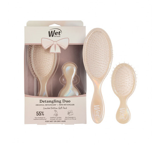 Detangling at home and on-the-go in a holographic dream. This limited edition WetBrush Holographic Detangler Kit Cream includes the Original Detangler and a Mini Detangler. The world-famous, ultra-soft IntelliFlex bristles glide through tangles on all hair types with ease. The mini size is perfect for on-the-go. The moment you use it, youll feel the difference and never want to try another hairbrush again. Add some shine to your day with this limited edition Duo Kit.