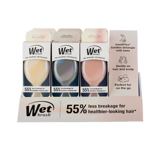 The WetBrush Mini Iridescence Display. Revolutionary IntelliFlex bristles diffuse knots on all hair types, wet or dry, gliding through tangles with less effort, less pain and over 55%* less breakage.