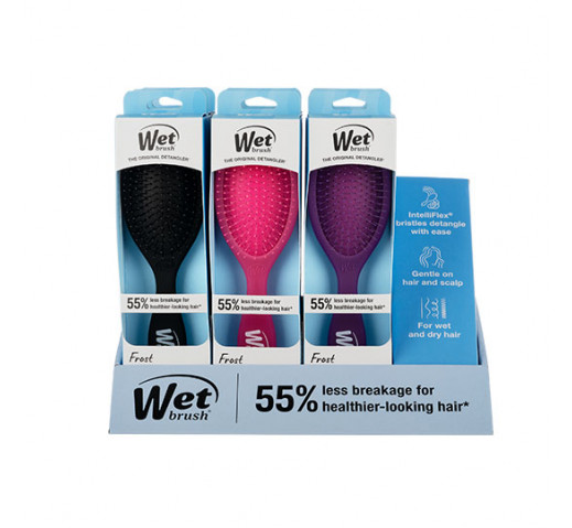 A stylish display featuring the WetBrush Frost collection. Revolutionary IntelliFlex bristles diffuse knots on all hair types, wet or dry, gliding through tangles with less effort, less pain and over 55% less breakage for healthier-looking hair*. *Independent testing shows IntelliFlex bristles create less breakage than a leading competitor. ** Do not use with hair dryer, as heat may damage the bristles. Use the WetBrush Pro Flex Dry instead.