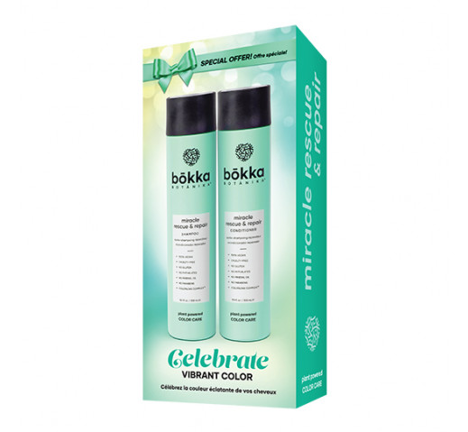 Protect and extend the life of hair colour with the Bokka Botanika Miracle Rescue Gift Box. This set will nourish and strengthen damaged or fragile, colour treated hair. Formulated with Quinoa Protein, Soy Protein and Guarana Seed Extract to help restore hair and add tremendous shine. Seals the hair cuticles that have been damaged after bleaching, colouring or heat styling. Protects and extends the life of hair colour with COLORLOKK COMPLEX.