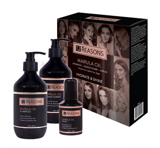 Cleanse and smooth unruly hair with the 12Reasons Marula Oil regime. Frizzy hair is deeply hydrated, leaving hair silky-smooth and feeling luxurious. Fruit and Seed Oil add softness and shine, taming unmanageable hair by intensely moisturising to smooth frizz with the shine serum for added shine whenever you need it.
