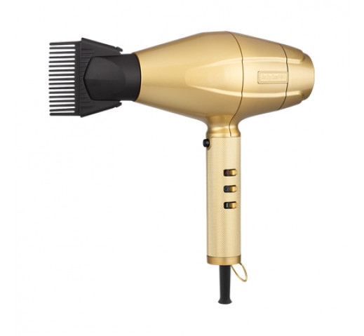 A barbers best friend! Designed for maximum airflow, low noise and optimal stability, BaBylissPRO GoldFX Hair Dryer is an Italian essential. Introducing the high-performance addition to BaBylissPROs GoldFX collection of clippers, trimmers and shavers. Your fastest blow-drying ever with an impeccably engineered 2,200W AC motor. The digital motor features a lifespan up to 10 times longer than traditional hair dryers. Ionic generator and beard pick attachment create sublime results every styling session. Classic good looks with knurled metal handle and gold finish. This is the perfect complement to the BaBylissPRO GoldFX collection.