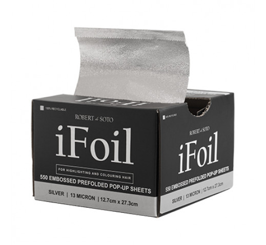Fast and easy foil with embossing! Robert de Soto makes foil super convenient with iFoil Embossed Pop Up 13 Micron in Silver. This standard-sized foil is great for all foiling work in the salon environment. Pre-folded sheets save precious time simply grab a foil and get going! Foils wont stick together or bend out of shape. Embossing on the foils grips the hair better than traditional foil, ensuring no slippage. 550 pre-folded, pop-up sheets. 100% recyclable. 13 microns and 12.7cm W x 27.3cm L in size.