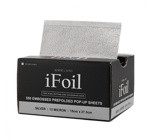 Fast and easy foil with embossing! Robert de Soto makes foil super convenient with iFoil Embossed Pop Up 13 Micron in Wide Silver. This wider foil is ideal for thicker sectioning. Larger surface area is great for colouring mid-lengths and ends of hair, such as balayage. Pre-folded sheets save precious time simply grab a foil and get going! Foils wont stick together or bend out of shape. Embossing on the foils grips the hair better than traditional foil, ensuring no slippage. 550 pre-folded, pop-up sheets. 100% recyclable. 13 microns and 15cm W x 27.3cm L in size.