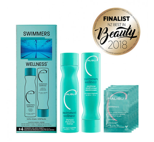 Malibu C Swimmers Wellness Hair Collection restores radiant shine and vibrant colour, removing green discolouration after swimming. Shields hair from pool chemicals like chlorine and sea salt, while combatting post-swim crunchy, gummy hair. 100% vegan, gluten free wellness formula adds superior manageability while infusing vital moisture. For all ages and hair types.