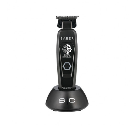 StyleCraft by Silver Bullet Saber Digital Brushless Trimmer Black is a hero trimmer for agility, efficiency and smoothness. Long-life digital brushless motor runs at 7,500 rpm for more efficient power transfer, ensuring smooth operation and heat reduction. Heavy duty, all-metal body with slim design. Black diamond carbon DLC X-Pro wide fixed blade and The One deep tooth moving blade are an unbeatable combo. Fully adjustable zero gap for the closest cut and finish. Skeleton design exposes the blade for superior sightline and improved precision. Lithium-ion battery delivers four hours of cordless runtime with a 90 minute recharge. Universal USB rechargeable.